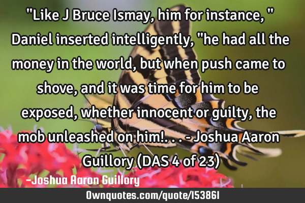 ''Like J Bruce Ismay, him for instance,'' Daniel inserted intelligently, ''he had all the money in the world, but when push came to shove, and it was time for him to be exposed, whether innocent or guilty, the mob unleashed on him!... - Joshua Aaron Guillory (DAS 4 of 23) -Joshua Aaron Guillory
