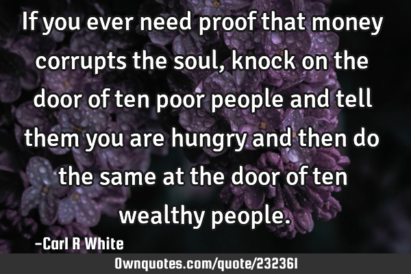 If you ever need proof that money corrupts the soul, knock on the door of ten poor people and tell them you are hungry and then do the same at the door of ten wealthy people. -Carl R White