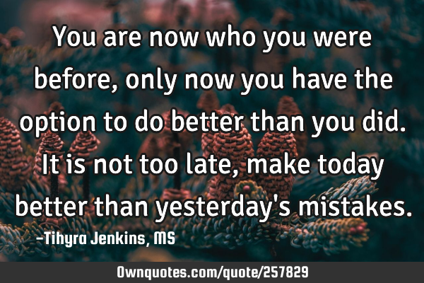 You are now who you were before, only now you have the option to do better than you did. It is not too late, make today better than yesterday's mistakes. -Tihyra Jenkins, MS